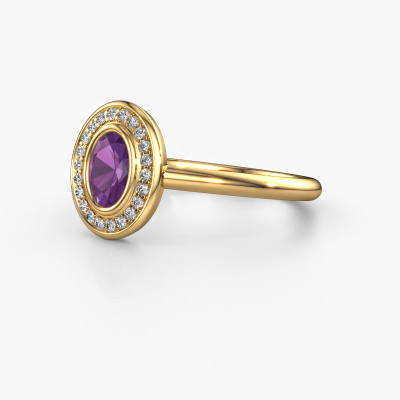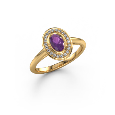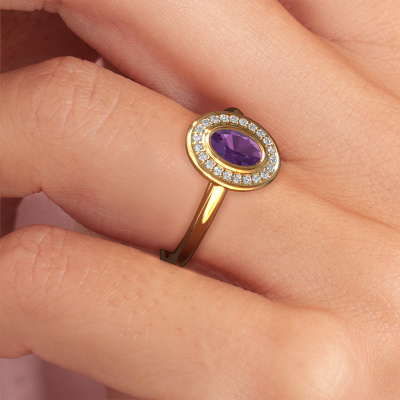 The ring shown above is called the Noud 1 OVL. We call this type of ring a halo ring because it has one centre gemstone and a band that is also pave set with gemstones. The 14 Carat gold engagement ring is set with a oval 6x4 mm amethyst centre stone and the band is pave set with lab-grown diamonds. What makes this classic gold halo ring special are the smaller sized stones embracing the centre stone. This gorgeous engagement ring is called a halo ring because the smaller gemstones give the centre stone a halo of surrounding light. In order for the smaller stones to enhance the centre stone, they have to be placed so there is no interference of light. And that's when our expert goldsmiths come in. Each individual stone is carefully set in the ring by hand. During manufacturing, light fall is constantly monitored to make sure the special halo is still visible. In the end you get a unique engagement ring, with a amethyst of your choosing at its centre. You can imagine the effect of a ring of such significance when you give it to her on her special day to shine. By using a combination of the latest modern techniques, combined with ancient crafting, we can make all our engagement rings in our own studio. Each jewel is made to order. This is advantageous because we can offer you a price you won't find anywhere else.Our team adds new designs to our online collection daily. Our designers and goldsmiths work together in creating the best design. We strive to offer a diverse collection of jewels. Perhaps you have a specific jewel design in mind. One you came across somewhere. Please contact us for a free consultation. We will make you an offer, based on a fair price/ quality ratio, that will baffle you.To make it easier for you, we offer a 30 day return policy. Check our terms and conditions.