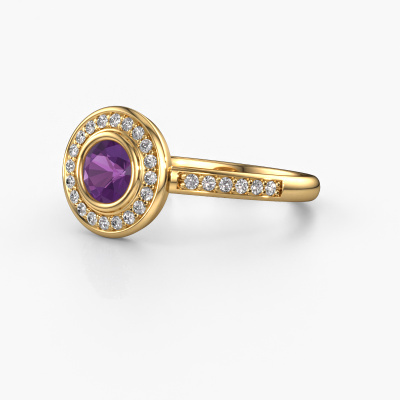 The ring shown above is called the Noud 2 RND. We call this type of ring a halo ring because it has one centre gemstone and a band that is also pave set with gemstones. The 14 Carat gold engagement ring is set with a round 5 mm amethyst centre stone and the band is pave set with diamonds. What makes this luxury gold halo ring special are the smaller sized stones embracing the centre stone. This gorgeous engagement ring is called a halo ring because the smaller gemstones give the centre stone a halo of surrounding light. In order for the smaller stones to enhance the centre stone, they have to be placed so there is no interference of light. And that's when our expert goldsmiths come in. Each individual stone is carefully set in the ring by hand. During manufacturing, light fall is constantly monitored to make sure the special halo is still visible. In the end you get a unique engagement ring, with a amethyst of your choosing at its centre. You can imagine the effect of a ring of such significance when you give it to her on her special day to shine. By using a combination of the latest modern techniques, combined with ancient crafting, we can make all our engagement rings in our own studio. Each jewel is made to order. This is advantageous because we can offer you a price you won't find anywhere else.Have you found a specific engagement ring somewhere which you would like to give to your loved one? Please feel free to express your wishes to our jewel designers because we would be honoured to turn your design into a luxury engagement ring. You can follow the development of your ring design because we use 3D drawings. This gives you a realistic preview of how your design will look. You can also preorder a dummy. A dummy is a plastic ring, which can be shaped according your ring design. You can try it on and check if its width and size are suitable for you. We will gladly send you a non-binding offer, based on a fair price/ quality ratio. It will amaze you, considering the quality of the ring and gemstones.To make it easier for you, we offer a 30 day return policy. Check our terms and conditions.