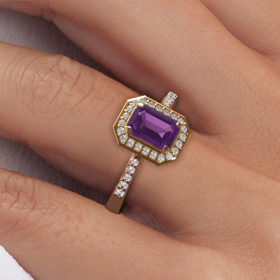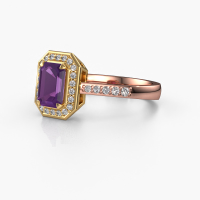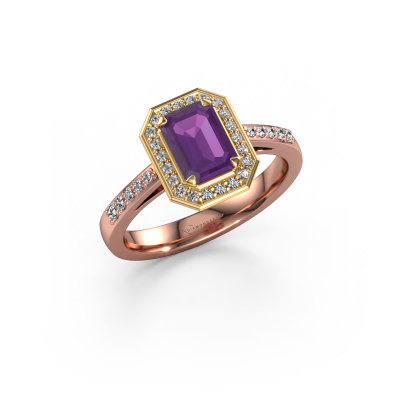This 14 Carat rose gold ring is called Dodie 2 eme and is set with 7x5 mm amethyst. This exclusive rose gold halo engagement ring is a true work of art! The ornaments are crafted with a lot of patience and great passion. In order to create this ring with great precision, this craft requires a keen eye and skilful hand. A challenge which ignites a fire in our expert goldsmith. The exquisite amethysten are set in a special way so they stand out even more. This gives the ring an even more glamorous appearance. The pretty engagement ring is actually unique on its own because of the gemstones which we carefully select especially for this ring. On top of that you select the precious metals which will be used to create a unique ring for the most extraordinary woman in your life! This jewel is made just for you, with attention to detail and design.Because we design and deliver our own rings, we can offer you a engagement ring at a price you won't find anywhere else. A ring is made to order, which helps prevent excess supplies, so we can make you a great price offer. We understand it feels risky, buying your engagement ring online, but we will gladly assist in the designing process, taking your budget into consideration.Do you have a specific ring in mind? One you came across somewhere. Please feel free to tell us your wishes and we will turn your design into a unique engagement ring. You can follow the development of your ring design because we use 3D drawings. This gives you a realistic preview of your design. We will gladly send you a non-binding offer, based on a fair price/ quality ratio. It will amaze you.To make it easier for you, we offer a 30 day return policy. Check our terms and conditions.