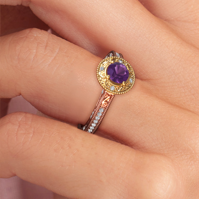 This 14 Carat rose gold ring is called Alice RND and is set with 5 mm amethyst. An extraordinary rose gold vintage ring. One that will surely make the love of your life shine like a diamond! That is what we hope to achieve. This vintage Engagement ring is set with exquisite amethyst. Whichever gemstone you choose from our selection, is up to you. The gemstone is selected with great care because we believe your pearl edges Engagement ring must be adorned with nothing but the most beautiful gemstone. Wouldn't you agree? Our expert goldsmith will design your ring in our own crafting studio, where the amethyst will be set with great precision. The ring will then be polished till it shines perfectly. Nothing but the best for the love of your life! This jewel is made to shine bright around your finger. Each jewel is hand made with love by our goldsmiths.Are you on a budget? Please feel free to contact us, so we can go discuss your options. We offer our Engagement rings at guaranteed best price, because we make them to order. You won't find such a price anywhere else!Our team adds new designs to our online collection daily. Our designers and goldsmiths work together in creating the best design. We strive to offer a diverse collection of jewels. Perhaps you have a specific jewel design in mind. One you came across somewhere. Please contact us for a free consultation. We will make you an offer, based on a fair price/ quality ratio, that will baffle you.To make it easier for you, we offer a 30 day return policy. Check our terms and conditions.