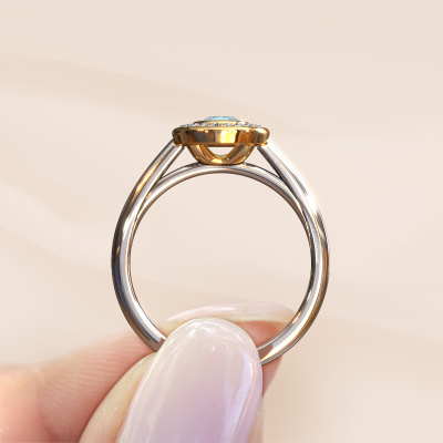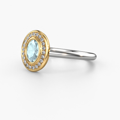 The ring shown above is called the Noud 1 OVL. We call this type of ring a halo ring because it has one centre gemstone and a band that is also pave set with gemstones. The 14 Carat white gold engagement ring is set with a oval 6x4 mm aquamarine centre stone and the band is pave set with lab-grown diamonds. What makes this classic white gold halo ring special are the smaller sized stones embracing the centre stone. This gorgeous engagement ring is called a halo ring because the smaller gemstones give the centre stone a halo of surrounding light. In order for the smaller stones to enhance the centre stone, they have to be placed so there is no interference of light. And that's when our expert goldsmiths come in. Each individual stone is carefully set in the ring by hand. During manufacturing, light fall is constantly monitored to make sure the special halo is still visible. In the end you get a unique engagement ring, with a aquamarine of your choosing at its centre. You can imagine the effect of a ring of such significance when you give it to her on her special day to shine. By using a combination of the latest modern techniques, combined with ancient crafting, we can make all our engagement rings in our own studio. Each jewel is made to order. This is advantageous because we can offer you a price you won't find anywhere else.Our team adds new designs to our online collection daily. Our designers and goldsmiths work together in creating the best design. We strive to offer a diverse collection of jewels. Perhaps you have a specific jewel design in mind. One you came across somewhere. Please contact us for a free consultation. We will make you an offer, based on a fair price/ quality ratio, that will baffle you.To make it easier for you, we offer a 30 day return policy. Check our terms and conditions.