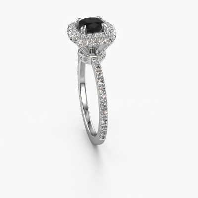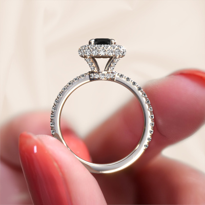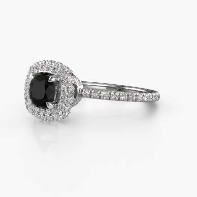 The ring shown above is called the Talitha CUS. We call this type of ring a halo ring because it has one centre gemstone and a band that is also pave set with gemstones. The platinum engagement ring is set with a cushion 0.70 crt black diamond centre stone and the band is pave set with diamonds. What makes this traditional platinum halo ring special are the smaller sized stones embracing the centre stone. This gorgeous engagement ring is called a halo ring because the smaller gemstones give the centre stone a halo of surrounding light. In order for the smaller stones to enhance the centre stone, they have to be placed so there is no interference of light. And that's when our expert goldsmiths come in. Each individual stone is carefully set in the ring by hand. During manufacturing, light fall is constantly monitored to make sure the special halo is still visible. In the end you get a unique engagement ring, with a black diamond of your choosing at its centre. You can imagine the effect of a ring of such significance when you give it to her on her special day to shine. Because we design and deliver our own rings, we can offer you a engagement ring at a price you won't find anywhere else. A ring is made to order, which helps prevent excess supplies, so we can make you a great price offer. We understand it feels risky, buying your engagement ring online, but we will gladly assist in the designing process, taking your budget into consideration.Our designers and goldsmiths work together each day, creating new jewels. Perhaps you have found a nice traditional engagement ring somewhere, which can be used to customize your unique ring. Please feel free to contact us. We will make you an offer, based on a fair price/ quality ratio, which will amaze you.To make it easier for you, we offer a 30 day return policy. Check our terms and conditions.