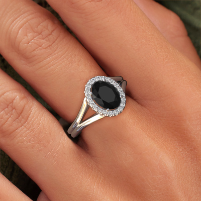 This 14 Carat white gold ring is called Verla ovl 1 and is set with 1.550 crt black diamond. This exclusive white gold halo engagement ring is a true work of art! The ornaments are crafted with a lot of patience and great passion. In order to create this ring with great precision, this craft requires a keen eye and skilful hand. A challenge which ignites a fire in our expert goldsmith. The exquisite black diamonds are set in a special way so they stand out even more. This gives the ring an even more glamorous appearance. The split band engagement ring is actually unique on its own because of the gemstones which we carefully select especially for this ring. On top of that you select the precious metals which will be used to create a unique ring for the most extraordinary woman in your life! This jewel is made to shine bright around your finger. Each jewel is hand made with love by our goldsmiths.By using a combination of the latest modern techniques, combined with ancient crafting, we can make all our engagement rings in our own studio. Each jewel is made to order. This is advantageous because we can offer you a price you won't find anywhere else.Do you have a specific ring in mind? One you came across somewhere. Please feel free to tell us your wishes and we will turn your design into a unique engagement ring. You can follow the development of your ring design because we use 3D drawings. This gives you a realistic preview of your design. We will gladly send you a non-binding offer, based on a fair price/ quality ratio. It will amaze you.To make it easier for you, we offer a 30 day return policy. Check our terms and conditions.
