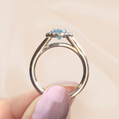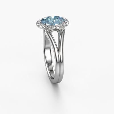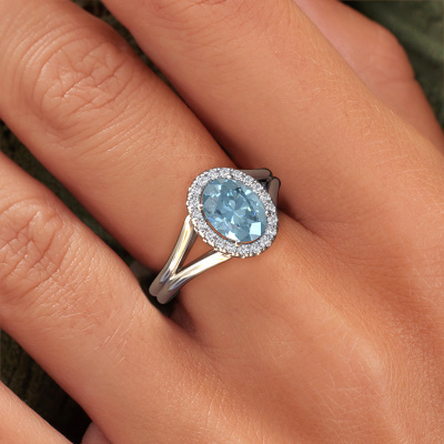 This 14 Carat white gold ring is called Verla ovl 1 and is set with 8x6 mm blue lab grown diamond. This exclusive white gold halo engagement ring is a true work of art! The ornaments are crafted with a lot of patience and great passion. In order to create this ring with great precision, this craft requires a keen eye and skilful hand. A challenge which ignites a fire in our expert goldsmith. The exquisite blue lab grown diamonds are set in a special way so they stand out even more. This gives the ring an even more glamorous appearance. The split band engagement ring is actually unique on its own because of the gemstones which we carefully select especially for this ring. On top of that you select the precious metals which will be used to create a unique ring for the most extraordinary woman in your life! This jewel is made to shine bright around your finger. Each jewel is hand made with love by our goldsmiths.By using a combination of the latest modern techniques, combined with ancient crafting, we can make all our engagement rings in our own studio. Each jewel is made to order. This is advantageous because we can offer you a price you won't find anywhere else.Do you have a specific ring in mind? One you came across somewhere. Please feel free to tell us your wishes and we will turn your design into a unique engagement ring. You can follow the development of your ring design because we use 3D drawings. This gives you a realistic preview of your design. We will gladly send you a non-binding offer, based on a fair price/ quality ratio. It will amaze you.To make it easier for you, we offer a 30 day return policy. Check our terms and conditions.