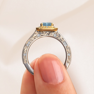 This 14 Carat white gold ring is called Alice EME and is set with 7x5 mm blue lab grown diamond. An extraordinary white gold vintage ring. One that will surely make the love of your life shine like a diamond! That is what we hope to achieve. This vintage Engagement ring is set with exquisite blue lab grown diamond. Whichever gemstone you choose from our selection, is up to you. The gemstone is selected with great care because we believe your pearl edges Engagement ring must be adorned with nothing but the most beautiful gemstone. Wouldn't you agree? Our expert goldsmith will design your ring in our own crafting studio, where the blue lab grown diamond will be set with great precision. The ring will then be polished till it shines perfectly. Nothing but the best for the love of your life! This jewel is made just for you by our master goldsmiths in our own studio.By using a combination of the latest modern techniques, combined with ancient crafting, we can make all our Engagement rings in our own studio. Each jewel is made to order. This is advantageous because we can offer you a price you won't find anywhere else.Do you have a specific ring in mind? One you came across somewhere. Please feel free to tell us your wishes and we will turn your design into a unique Engagement ring. You can follow the development of your ring design because we use 3D drawings. This gives you a realistic preview of your design. We will gladly send you a non-binding offer, based on a fair price/ quality ratio. It will amaze you.To make it easier for you, we offer a 30 day return policy. Check our terms and conditions.