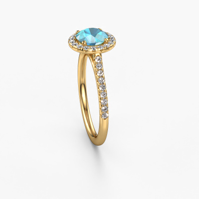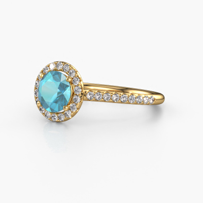 The ring shown above is called the Seline rnd 2. We call this type of ring a halo ring because it has one centre gemstone and a band that is also pave set with gemstones. The 14 Carat gold engagement ring is set with a round 6.5 mm blue topaz centre stone and the band is pave set with lab-grown diamonds. What makes this exclusive gold halo ring special are the smaller sized stones embracing the centre stone. This gorgeous engagement ring is called a halo ring because the smaller gemstones give the centre stone a halo of surrounding light. In order for the smaller stones to enhance the centre stone, they have to be placed so there is no interference of light. And that's when our expert goldsmiths come in. Each individual stone is carefully set in the ring by hand. During manufacturing, light fall is constantly monitored to make sure the special halo is still visible. In the end you get a unique engagement ring, with a blue topaz of your choosing at its centre. You can imagine the effect of a ring of such significance when you give it to her on her special day to shine. After receiving your order, our goldsmiths will start the creative process of making your Seline rnd 2 engagement ring. We don't keep stock. This is advantageous because these costs will not be passed on to you. Therefore, we can offer jewellery at exceptionally low prices.Our team adds new designs to our online collection daily. Our designers and goldsmiths work together in creating the best design. We strive to offer a diverse collection of jewels. Perhaps you have a specific jewel design in mind. One you came across somewhere. Please contact us for a free consultation. We will make you an offer, based on a fair price/ quality ratio, that will baffle you.To make it easier for you, we offer a 30 day return policy. Check our terms and conditions.