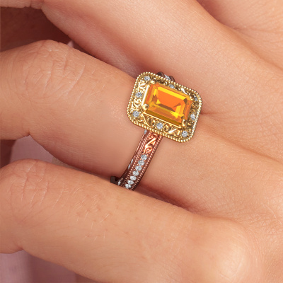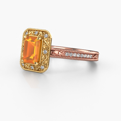 This 14 Carat rose gold ring is called Alice EME and is set with 7x5 mm citrin. An extraordinary rose gold vintage ring. One that will surely make the love of your life shine like a diamond! That is what we hope to achieve. This vintage Engagement ring is set with exquisite citrin. Whichever gemstone you choose from our selection, is up to you. The gemstone is selected with great care because we believe your pearl edges Engagement ring must be adorned with nothing but the most beautiful gemstone. Wouldn't you agree? Our expert goldsmith will design your ring in our own crafting studio, where the citrin will be set with great precision. The ring will then be polished till it shines perfectly. Nothing but the best for the love of your life! This jewel is made just for you by our master goldsmiths in our own studio.By using a combination of the latest modern techniques, combined with ancient crafting, we can make all our Engagement rings in our own studio. Each jewel is made to order. This is advantageous because we can offer you a price you won't find anywhere else.Do you have a specific ring in mind? One you came across somewhere. Please feel free to tell us your wishes and we will turn your design into a unique Engagement ring. You can follow the development of your ring design because we use 3D drawings. This gives you a realistic preview of your design. We will gladly send you a non-binding offer, based on a fair price/ quality ratio. It will amaze you.To make it easier for you, we offer a 30 day return policy. Check our terms and conditions.