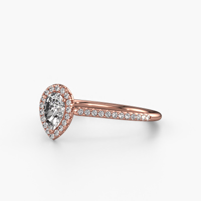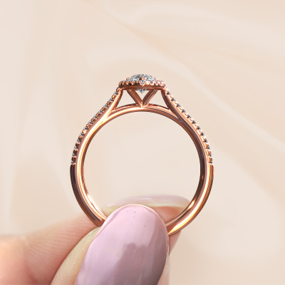 The ring shown above is called the Seline per 2. We call this type of ring a halo ring because it has one centre gemstone and a band that is also pave set with gemstones. The 14 Carat rose gold engagement ring is set with a pear 0.45 crt diamond centre stone and the band is pave set with diamonds. What makes this classic rose gold halo ring special are the smaller sized stones embracing the centre stone. This gorgeous engagement ring is called a halo ring because the smaller gemstones give the centre stone a halo of surrounding light. In order for the smaller stones to enhance the centre stone, they have to be placed so there is no interference of light. And that's when our expert goldsmiths come in. Each individual stone is carefully set in the ring by hand. During manufacturing, light fall is constantly monitored to make sure the special halo is still visible. In the end you get a unique engagement ring, with a diamond of your choosing at its centre. You can imagine the effect of a ring of such significance when you give it to her on her special day to shine. Because we design and deliver our own rings, we can offer you a engagement ring at a price you won't find anywhere else. A ring is made to order, which helps prevent excess supplies, so we can make you a great price offer. We understand it feels risky, buying your engagement ring online, but we will gladly assist in the designing process, taking your budget into consideration.Our designers and goldsmiths work together each day, creating new jewels. Perhaps you have found a nice classic engagement ring somewhere, which can be used to customize your unique ring. Please feel free to contact us. We will make you an offer, based on a fair price/ quality ratio, which will amaze you.To make it easier for you, we offer a 30 day return policy. Check our terms and conditions.