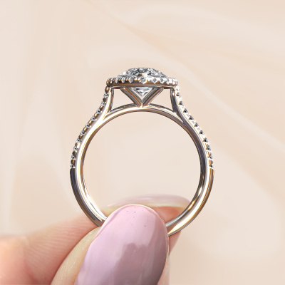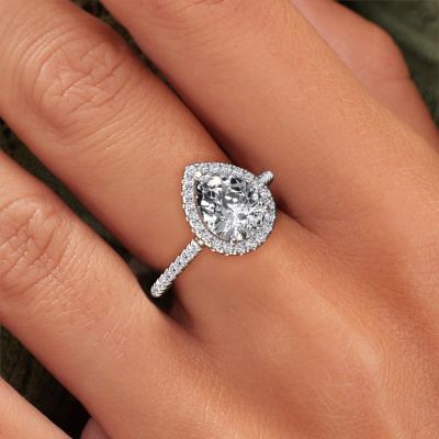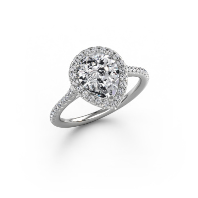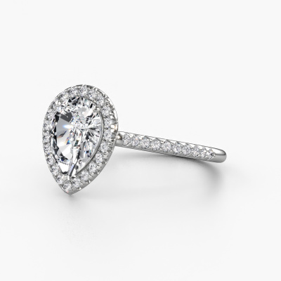The ring shown above is called the Seline per 2. We call this type of ring a halo ring because it has one centre gemstone and a band that is also pave set with gemstones. The 14 Carat white gold engagement ring is set with a pear 1.50 crt diamond centre stone and the band is pave set with diamonds. What makes this classic white gold halo ring special are the smaller sized stones embracing the centre stone. This gorgeous engagement ring is called a halo ring because the smaller gemstones give the centre stone a halo of surrounding light. In order for the smaller stones to enhance the centre stone, they have to be placed so there is no interference of light. And that's when our expert goldsmiths come in. Each individual stone is carefully set in the ring by hand. During manufacturing, light fall is constantly monitored to make sure the special halo is still visible. In the end you get a unique engagement ring, with a diamond of your choosing at its centre. You can imagine the effect of a ring of such significance when you give it to her on her special day to shine. Because we design and deliver our own rings, we can offer you a engagement ring at a price you won't find anywhere else. A ring is made to order, which helps prevent excess supplies, so we can make you a great price offer. We understand it feels risky, buying your engagement ring online, but we will gladly assist in the designing process, taking your budget into consideration.Our designers and goldsmiths work together each day, creating new jewels. Perhaps you have found a nice classic engagement ring somewhere, which can be used to customize your unique ring. Please feel free to contact us. We will make you an offer, based on a fair price/ quality ratio, which will amaze you.To make it easier for you, we offer a 30 day return policy. Check our terms and conditions.
