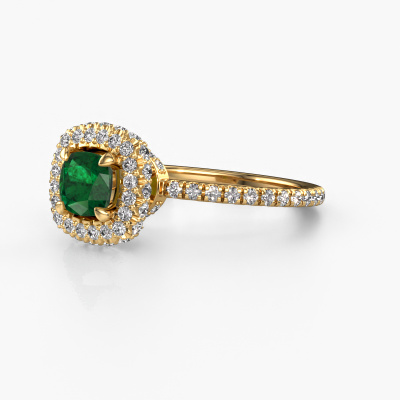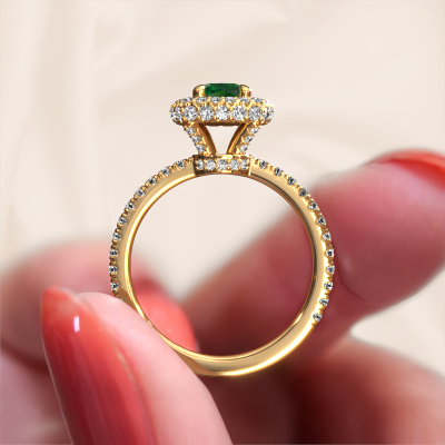 The ring shown above is called the Talitha CUS. We call this type of ring a halo ring because it has one centre gemstone and a band that is also pave set with gemstones. The 14 Carat gold engagement ring is set with a cushion 5 mm emerald centre stone and the band is pave set with diamonds. What makes this traditional gold halo ring special are the smaller sized stones embracing the centre stone. This gorgeous engagement ring is called a halo ring because the smaller gemstones give the centre stone a halo of surrounding light. In order for the smaller stones to enhance the centre stone, they have to be placed so there is no interference of light. And that's when our expert goldsmiths come in. Each individual stone is carefully set in the ring by hand. During manufacturing, light fall is constantly monitored to make sure the special halo is still visible. In the end you get a unique engagement ring, with a emerald of your choosing at its centre. You can imagine the effect of a ring of such significance when you give it to her on her special day to shine. Because we design and deliver our own rings, we can offer you a engagement ring at a price you won't find anywhere else. A ring is made to order, which helps prevent excess supplies, so we can make you a great price offer. We understand it feels risky, buying your engagement ring online, but we will gladly assist in the designing process, taking your budget into consideration.Our designers and goldsmiths work together each day, creating new jewels. Perhaps you have found a nice traditional engagement ring somewhere, which can be used to customize your unique ring. Please feel free to contact us. We will make you an offer, based on a fair price/ quality ratio, which will amaze you.To make it easier for you, we offer a 30 day return policy. Check our terms and conditions.