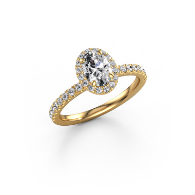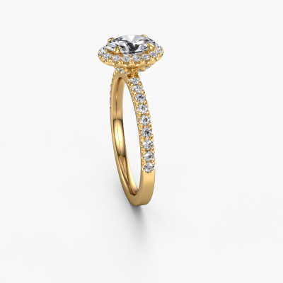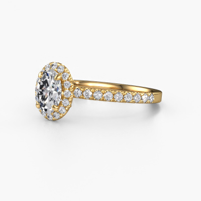 The ring shown above is called the Miranda OVL. We call this type of ring a halo ring because it has one centre gemstone and a band that is also pave set with gemstones. The 14 Carat gold engagement ring is set with a oval 0.70 crt diamond centre stone and the band is pave set with lab-grown diamonds. What makes this exclusive gold halo ring special are the smaller sized stones embracing the centre stone. This gorgeous engagement ring is called a halo ring because the smaller gemstones give the centre stone a halo of surrounding light. In order for the smaller stones to enhance the centre stone, they have to be placed so there is no interference of light. And that's when our expert goldsmiths come in. Each individual stone is carefully set in the ring by hand. During manufacturing, light fall is constantly monitored to make sure the special halo is still visible. In the end you get a unique engagement ring, with a diamond of your choosing at its centre. You can imagine the effect of a ring of such significance when you give it to her on her special day to shine. By using a combination of the latest modern techniques, combined with ancient crafting, we can make all our engagement rings in our own studio. Each jewel is made to order. This is advantageous because we can offer you a price you won't find anywhere else.Our designers and goldsmiths work together each day, creating new jewels. Perhaps you have found a nice exclusive engagement ring somewhere, which can be used to customize your unique ring. Please feel free to contact us. We will make you an offer, based on a fair price/ quality ratio, which will amaze you.To make it easier for you, we offer a 30 day return policy. Check our terms and conditions.