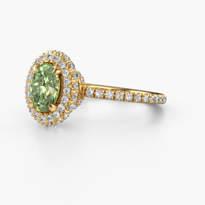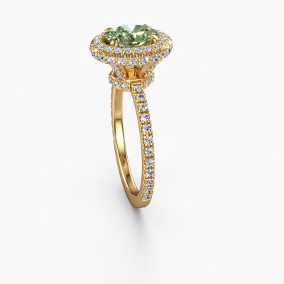 The ring shown above is called the Talitha OVL. We call this type of ring a halo ring because it has one centre gemstone and a band that is also pave set with gemstones. The 14 Carat gold engagement ring is set with a oval 7x5 mm green lab grown diamond centre stone and the band is pave set with lab-grown diamonds. What makes this classic gold halo ring special are the smaller sized stones embracing the centre stone. This gorgeous engagement ring is called a halo ring because the smaller gemstones give the centre stone a halo of surrounding light. In order for the smaller stones to enhance the centre stone, they have to be placed so there is no interference of light. And that's when our expert goldsmiths come in. Each individual stone is carefully set in the ring by hand. During manufacturing, light fall is constantly monitored to make sure the special halo is still visible. In the end you get a unique engagement ring, with a green lab grown diamond of your choosing at its centre. You can imagine the effect of a ring of such significance when you give it to her on her special day to shine. By using a combination of the latest modern techniques, combined with ancient crafting, we can make all our engagement rings in our own studio. Each jewel is made to order. This is advantageous because we can offer you a price you won't find anywhere else.Our designers and goldsmiths work together each day, creating new jewels. Perhaps you have found a nice classic engagement ring somewhere, which can be used to customize your unique ring. Please feel free to contact us. We will make you an offer, based on a fair price/ quality ratio, which will amaze you.To make it easier for you, we offer a 30 day return policy. Check our terms and conditions.