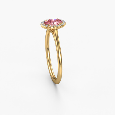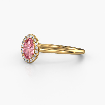 The ring shown above is called the Seline ovl 1. We call this type of ring a halo ring because it has one centre gemstone and a band that is also pave set with gemstones. The 14 Carat gold engagement ring is set with a oval 6x4 mm pink lab grown diamond centre stone and the band is pave set with diamonds. What makes this classic gold halo ring special are the smaller sized stones embracing the centre stone. This gorgeous engagement ring is called a halo ring because the smaller gemstones give the centre stone a halo of surrounding light. In order for the smaller stones to enhance the centre stone, they have to be placed so there is no interference of light. And that's when our expert goldsmiths come in. Each individual stone is carefully set in the ring by hand. During manufacturing, light fall is constantly monitored to make sure the special halo is still visible. In the end you get a unique engagement ring, with a pink lab grown diamond of your choosing at its centre. You can imagine the effect of a ring of such significance when you give it to her on her special day to shine. Are you on a budget? Please feel free to contact us, so we can go discuss your options. We offer our engagement rings at guaranteed best price, because we make them to order. You won't find such a price anywhere else!Our team adds new designs to our online collection daily. Our designers and goldsmiths work together in creating the best design. We strive to offer a diverse collection of jewels. Perhaps you have a specific jewel design in mind. One you came across somewhere. Please contact us for a free consultation. We will make you an offer, based on a fair price/ quality ratio, that will baffle you.To make it easier for you, we offer a 30 day return policy. Check our terms and conditions.