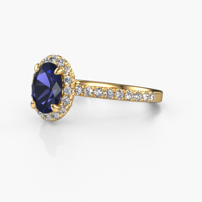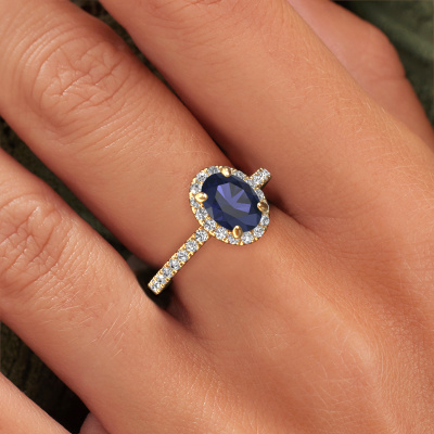 The ring shown above is called the Miranda ovl. We call this type of ring a halo ring because it has one centre gemstone and a band that is also pave set with gemstones. The 14 Carat gold engagement ring is set with a oval 8x6 mm sapphire centre stone and the band is pave set with lab-grown diamonds. What makes this exclusive gold halo ring special are the smaller sized stones embracing the centre stone. This gorgeous engagement ring is called a halo ring because the smaller gemstones give the centre stone a halo of surrounding light. In order for the smaller stones to enhance the centre stone, they have to be placed so there is no interference of light. And that's when our expert goldsmiths come in. Each individual stone is carefully set in the ring by hand. During manufacturing, light fall is constantly monitored to make sure the special halo is still visible. In the end you get a unique engagement ring, with a sapphire of your choosing at its centre. You can imagine the effect of a ring of such significance when you give it to her on her special day to shine. By using a combination of the latest modern techniques, combined with ancient crafting, we can make all our engagement rings in our own studio. Each jewel is made to order. This is advantageous because we can offer you a price you won't find anywhere else.Our designers and goldsmiths work together each day, creating new jewels. Perhaps you have found a nice exclusive engagement ring somewhere, which can be used to customize your unique ring. Please feel free to contact us. We will make you an offer, based on a fair price/ quality ratio, which will amaze you.To make it easier for you, we offer a 30 day return policy. Check our terms and conditions.
