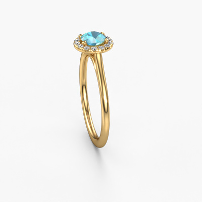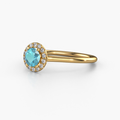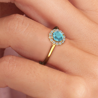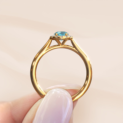 The ring shown above is called the Seline rnd 1. We call this type of ring a halo ring because it has one centre gemstone and a band that is also pave set with gemstones. The 14 Carat gold engagement ring is set with a round 5 mm blue topaz centre stone and the band is pave set with diamonds. What makes this classic gold halo ring special are the smaller sized stones embracing the centre stone. This gorgeous engagement ring is called a halo ring because the smaller gemstones give the centre stone a halo of surrounding light. In order for the smaller stones to enhance the centre stone, they have to be placed so there is no interference of light. And that's when our expert goldsmiths come in. Each individual stone is carefully set in the ring by hand. During manufacturing, light fall is constantly monitored to make sure the special halo is still visible. In the end you get a unique engagement ring, with a blue topaz of your choosing at its centre. You can imagine the effect of a ring of such significance when you give it to her on her special day to shine. By using our modern techniques, we can design and customize the finest quality jewels with the utmost care for you. Our engagement rings are always priced 30 percent lower than other jewellers. We make engagement rings to order so we don't have to maintain a large stock. If you have a certain budget, we are more than happy to advice you accordingly.Different styles of new rings are made daily by our team. Perhaps you have found a halo engagement ring somewhere. One you would like to give to your loved one. Please feel free to share your thoughts and design with our jewel designers. We would love to turn your design into a classic engagement ring. You can follow the development of your ring design because we use very detailed 3D drawings. On top of that, you can order a dummy of the design. A dummy is a plastic ring, which can be shaped according your ring design. You can try it on and check if the engagement ring is up to standard. We will gladly send you a non-binding offer, based on a fair price/ quality ratio. The offer will baffle you, considering the quality of the ring and gemstones.To make it easier for you, we offer a 30 day return policy. Check our terms and conditions.