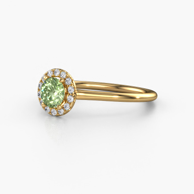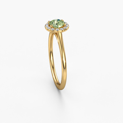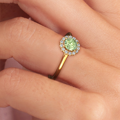 The ring shown above is called the Seline rnd 1. We call this type of ring a halo ring because it has one centre gemstone and a band that is also pave set with gemstones. The 14 Carat gold engagement ring is set with a round 5 mm green lab grown diamond centre stone and the band is pave set with diamonds. What makes this classic gold halo ring special are the smaller sized stones embracing the centre stone. This gorgeous engagement ring is called a halo ring because the smaller gemstones give the centre stone a halo of surrounding light. In order for the smaller stones to enhance the centre stone, they have to be placed so there is no interference of light. And that's when our expert goldsmiths come in. Each individual stone is carefully set in the ring by hand. During manufacturing, light fall is constantly monitored to make sure the special halo is still visible. In the end you get a unique engagement ring, with a green lab grown diamond of your choosing at its centre. You can imagine the effect of a ring of such significance when you give it to her on her special day to shine. By using our modern techniques, we can design and customize the finest quality jewels with the utmost care for you. Our engagement rings are always priced 30 percent lower than other jewellers. We make engagement rings to order so we don't have to maintain a large stock. If you have a certain budget, we are more than happy to advice you accordingly.Different styles of new rings are made daily by our team. Perhaps you have found a halo engagement ring somewhere. One you would like to give to your loved one. Please feel free to share your thoughts and design with our jewel designers. We would love to turn your design into a classic engagement ring. You can follow the development of your ring design because we use very detailed 3D drawings. On top of that, you can order a dummy of the design. A dummy is a plastic ring, which can be shaped according your ring design. You can try it on and check if the engagement ring is up to standard. We will gladly send you a non-binding offer, based on a fair price/ quality ratio. The offer will baffle you, considering the quality of the ring and gemstones.To make it easier for you, we offer a 30 day return policy. Check our terms and conditions.