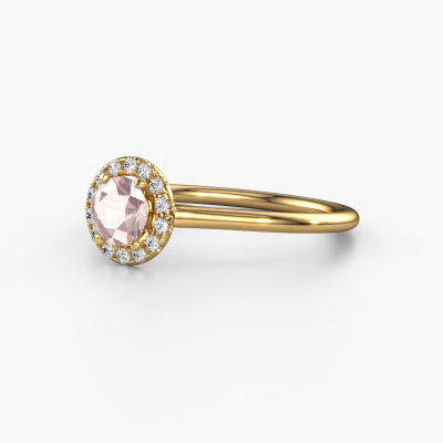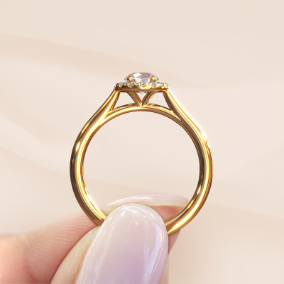 The ring shown above is called the Seline rnd 1. We call this type of ring a halo ring because it has one centre gemstone and a band that is also pave set with gemstones. The 14 Carat gold engagement ring is set with a round 5 mm morganite champagne centre stone and the band is pave set with diamonds. What makes this classic gold halo ring special are the smaller sized stones embracing the centre stone. This gorgeous engagement ring is called a halo ring because the smaller gemstones give the centre stone a halo of surrounding light. In order for the smaller stones to enhance the centre stone, they have to be placed so there is no interference of light. And that's when our expert goldsmiths come in. Each individual stone is carefully set in the ring by hand. During manufacturing, light fall is constantly monitored to make sure the special halo is still visible. In the end you get a unique engagement ring, with a morganite champagne of your choosing at its centre. You can imagine the effect of a ring of such significance when you give it to her on her special day to shine. By using our modern techniques, we can design and customize the finest quality jewels with the utmost care for you. Our engagement rings are always priced 30 percent lower than other jewellers. We make engagement rings to order so we don't have to maintain a large stock. If you have a certain budget, we are more than happy to advice you accordingly.Different styles of new rings are made daily by our team. Perhaps you have found a halo engagement ring somewhere. One you would like to give to your loved one. Please feel free to share your thoughts and design with our jewel designers. We would love to turn your design into a classic engagement ring. You can follow the development of your ring design because we use very detailed 3D drawings. On top of that, you can order a dummy of the design. A dummy is a plastic ring, which can be shaped according your ring design. You can try it on and check if the engagement ring is up to standard. We will gladly send you a non-binding offer, based on a fair price/ quality ratio. The offer will baffle you, considering the quality of the ring and gemstones.To make it easier for you, we offer a 30 day return policy. Check our terms and conditions.