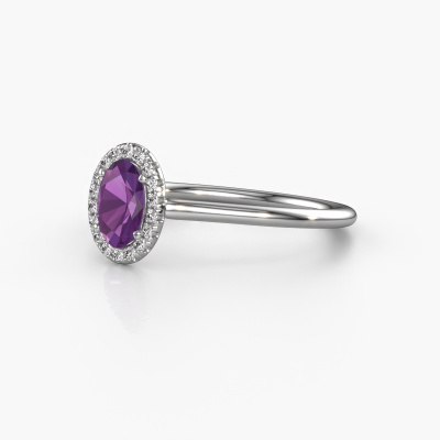 The ring shown above is called the Seline ovl 1. We call this type of ring a halo ring because it has one centre gemstone and a band that is also pave set with gemstones. The platinum engagement ring is set with a oval 6x4 mm amethyst centre stone and the band is pave set with diamonds. What makes this classic platinum halo ring special are the smaller sized stones embracing the centre stone. This gorgeous engagement ring is called a halo ring because the smaller gemstones give the centre stone a halo of surrounding light. In order for the smaller stones to enhance the centre stone, they have to be placed so there is no interference of light. And that's when our expert goldsmiths come in. Each individual stone is carefully set in the ring by hand. During manufacturing, light fall is constantly monitored to make sure the special halo is still visible. In the end you get a unique engagement ring, with a amethyst of your choosing at its centre. You can imagine the effect of a ring of such significance when you give it to her on her special day to shine. Are you on a budget? Please feel free to contact us, so we can go discuss your options. We offer our engagement rings at guaranteed best price, because we make them to order. You won't find such a price anywhere else!Our team adds new designs to our online collection daily. Our designers and goldsmiths work together in creating the best design. We strive to offer a diverse collection of jewels. Perhaps you have a specific jewel design in mind. One you came across somewhere. Please contact us for a free consultation. We will make you an offer, based on a fair price/ quality ratio, that will baffle you.To make it easier for you, we offer a 30 day return policy. Check our terms and conditions.
