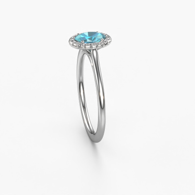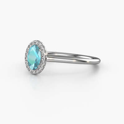 The ring shown above is called the Seline ovl 1. We call this type of ring a halo ring because it has one centre gemstone and a band that is also pave set with gemstones. The platinum engagement ring is set with a oval 6x4 mm blue topaz centre stone and the band is pave set with diamonds. What makes this classic platinum halo ring special are the smaller sized stones embracing the centre stone. This gorgeous engagement ring is called a halo ring because the smaller gemstones give the centre stone a halo of surrounding light. In order for the smaller stones to enhance the centre stone, they have to be placed so there is no interference of light. And that's when our expert goldsmiths come in. Each individual stone is carefully set in the ring by hand. During manufacturing, light fall is constantly monitored to make sure the special halo is still visible. In the end you get a unique engagement ring, with a blue topaz of your choosing at its centre. You can imagine the effect of a ring of such significance when you give it to her on her special day to shine. Are you on a budget? Please feel free to contact us, so we can go discuss your options. We offer our engagement rings at guaranteed best price, because we make them to order. You won't find such a price anywhere else!Our team adds new designs to our online collection daily. Our designers and goldsmiths work together in creating the best design. We strive to offer a diverse collection of jewels. Perhaps you have a specific jewel design in mind. One you came across somewhere. Please contact us for a free consultation. We will make you an offer, based on a fair price/ quality ratio, that will baffle you.To make it easier for you, we offer a 30 day return policy. Check our terms and conditions.