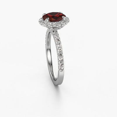 The ring shown above is called the Miranda ovl. We call this type of ring a halo ring because it has one centre gemstone and a band that is also pave set with gemstones. The platinum engagement ring is set with a oval 8x6 mm garnet centre stone and the band is pave set with lab-grown diamonds. What makes this exclusive platinum halo ring special are the smaller sized stones embracing the centre stone. This gorgeous engagement ring is called a halo ring because the smaller gemstones give the centre stone a halo of surrounding light. In order for the smaller stones to enhance the centre stone, they have to be placed so there is no interference of light. And that's when our expert goldsmiths come in. Each individual stone is carefully set in the ring by hand. During manufacturing, light fall is constantly monitored to make sure the special halo is still visible. In the end you get a unique engagement ring, with a garnet of your choosing at its centre. You can imagine the effect of a ring of such significance when you give it to her on her special day to shine. By using a combination of the latest modern techniques, combined with ancient crafting, we can make all our engagement rings in our own studio. Each jewel is made to order. This is advantageous because we can offer you a price you won't find anywhere else.Our designers and goldsmiths work together each day, creating new jewels. Perhaps you have found a nice exclusive engagement ring somewhere, which can be used to customize your unique ring. Please feel free to contact us. We will make you an offer, based on a fair price/ quality ratio, which will amaze you.To make it easier for you, we offer a 30 day return policy. Check our terms and conditions.