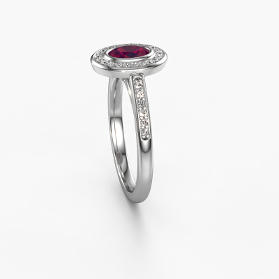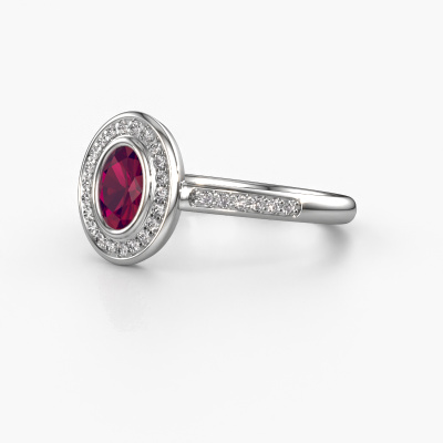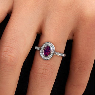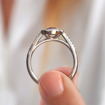 The ring shown above is called the Noud 2 OVL. We call this type of ring a halo ring because it has one centre gemstone and a band that is also pave set with gemstones. The platinum engagement ring is set with a oval 6x4 mm rhodolite centre stone and the band is pave set with lab-grown diamonds. What makes this exclusive platinum halo ring special are the smaller sized stones embracing the centre stone. This gorgeous engagement ring is called a halo ring because the smaller gemstones give the centre stone a halo of surrounding light. In order for the smaller stones to enhance the centre stone, they have to be placed so there is no interference of light. And that's when our expert goldsmiths come in. Each individual stone is carefully set in the ring by hand. During manufacturing, light fall is constantly monitored to make sure the special halo is still visible. In the end you get a unique engagement ring, with a rhodolite of your choosing at its centre. You can imagine the effect of a ring of such significance when you give it to her on her special day to shine. By using our modern techniques, we can design and customize the finest quality jewels with the utmost care for you. Our engagement rings are always priced 30 percent lower than other jewellers. We make engagement rings to order so we don't have to maintain a large stock. If you have a certain budget, we are more than happy to advice you accordingly.Have you found a specific engagement ring somewhere which you would like to give to your loved one? Please feel free to express your wishes to our jewel designers because we would be honoured to turn your design into a exclusive engagement ring. You can follow the development of your ring design because we use 3D drawings. This gives you a realistic preview of how your design will look. You can also preorder a dummy. A dummy is a plastic ring, which can be shaped according your ring design. You can try it on and check if its width and size are suitable for you. We will gladly send you a non-binding offer, based on a fair price/ quality ratio. It will amaze you, considering the quality of the ring and gemstones.To make it easier for you, we offer a 30 day return policy. Check our terms and conditions.