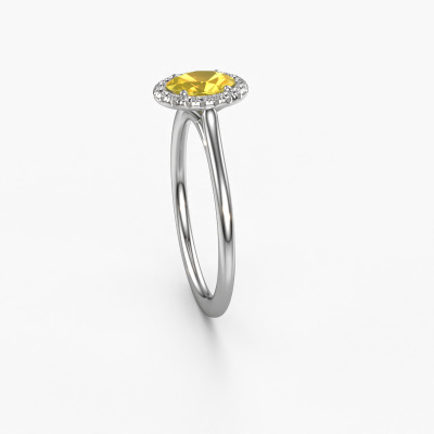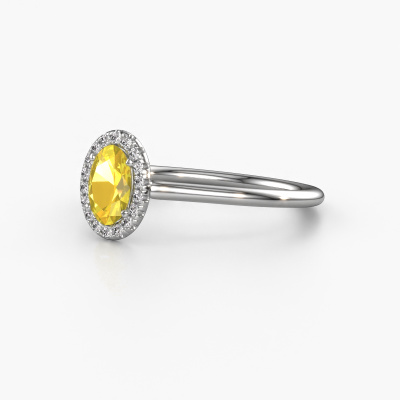 The ring shown above is called the Seline ovl 1. We call this type of ring a halo ring because it has one centre gemstone and a band that is also pave set with gemstones. The platinum engagement ring is set with a oval 6x4 mm yellow sapphire centre stone and the band is pave set with diamonds. What makes this classic platinum halo ring special are the smaller sized stones embracing the centre stone. This gorgeous engagement ring is called a halo ring because the smaller gemstones give the centre stone a halo of surrounding light. In order for the smaller stones to enhance the centre stone, they have to be placed so there is no interference of light. And that's when our expert goldsmiths come in. Each individual stone is carefully set in the ring by hand. During manufacturing, light fall is constantly monitored to make sure the special halo is still visible. In the end you get a unique engagement ring, with a yellow sapphire of your choosing at its centre. You can imagine the effect of a ring of such significance when you give it to her on her special day to shine. Are you on a budget? Please feel free to contact us, so we can go discuss your options. We offer our engagement rings at guaranteed best price, because we make them to order. You won't find such a price anywhere else!Our team adds new designs to our online collection daily. Our designers and goldsmiths work together in creating the best design. We strive to offer a diverse collection of jewels. Perhaps you have a specific jewel design in mind. One you came across somewhere. Please contact us for a free consultation. We will make you an offer, based on a fair price/ quality ratio, that will baffle you.To make it easier for you, we offer a 30 day return policy. Check our terms and conditions.