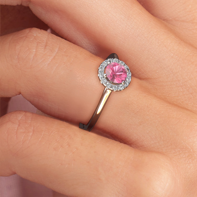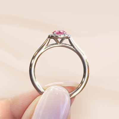 The ring shown above is called the Seline rnd 1. We call this type of ring a halo ring because it has one centre gemstone and a band that is also pave set with gemstones. The platinum engagement ring is set with a round 5 mm pink sapphire centre stone and the band is pave set with diamonds. What makes this classic platinum halo ring special are the smaller sized stones embracing the centre stone. This gorgeous engagement ring is called a halo ring because the smaller gemstones give the centre stone a halo of surrounding light. In order for the smaller stones to enhance the centre stone, they have to be placed so there is no interference of light. And that's when our expert goldsmiths come in. Each individual stone is carefully set in the ring by hand. During manufacturing, light fall is constantly monitored to make sure the special halo is still visible. In the end you get a unique engagement ring, with a pink sapphire of your choosing at its centre. You can imagine the effect of a ring of such significance when you give it to her on her special day to shine. By using our modern techniques, we can design and customize the finest quality jewels with the utmost care for you. Our engagement rings are always priced 30 percent lower than other jewellers. We make engagement rings to order so we don't have to maintain a large stock. If you have a certain budget, we are more than happy to advice you accordingly.Different styles of new rings are made daily by our team. Perhaps you have found a halo engagement ring somewhere. One you would like to give to your loved one. Please feel free to share your thoughts and design with our jewel designers. We would love to turn your design into a classic engagement ring. You can follow the development of your ring design because we use very detailed 3D drawings. On top of that, you can order a dummy of the design. A dummy is a plastic ring, which can be shaped according your ring design. You can try it on and check if the engagement ring is up to standard. We will gladly send you a non-binding offer, based on a fair price/ quality ratio. The offer will baffle you, considering the quality of the ring and gemstones.To make it easier for you, we offer a 30 day return policy. Check our terms and conditions.