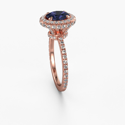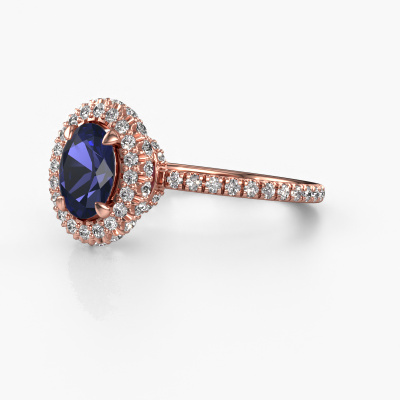 The ring shown above is called the Talitha OVL. We call this type of ring a halo ring because it has one centre gemstone and a band that is also pave set with gemstones. The 14 Carat rose gold engagement ring is set with a oval 7x5 mm sapphire centre stone and the band is pave set with lab-grown diamonds. What makes this classic rose gold halo ring special are the smaller sized stones embracing the centre stone. This gorgeous engagement ring is called a halo ring because the smaller gemstones give the centre stone a halo of surrounding light. In order for the smaller stones to enhance the centre stone, they have to be placed so there is no interference of light. And that's when our expert goldsmiths come in. Each individual stone is carefully set in the ring by hand. During manufacturing, light fall is constantly monitored to make sure the special halo is still visible. In the end you get a unique engagement ring, with a sapphire of your choosing at its centre. You can imagine the effect of a ring of such significance when you give it to her on her special day to shine. By using a combination of the latest modern techniques, combined with ancient crafting, we can make all our engagement rings in our own studio. Each jewel is made to order. This is advantageous because we can offer you a price you won't find anywhere else.Our designers and goldsmiths work together each day, creating new jewels. Perhaps you have found a nice classic engagement ring somewhere, which can be used to customize your unique ring. Please feel free to contact us. We will make you an offer, based on a fair price/ quality ratio, which will amaze you.To make it easier for you, we offer a 30 day return policy. Check our terms and conditions.