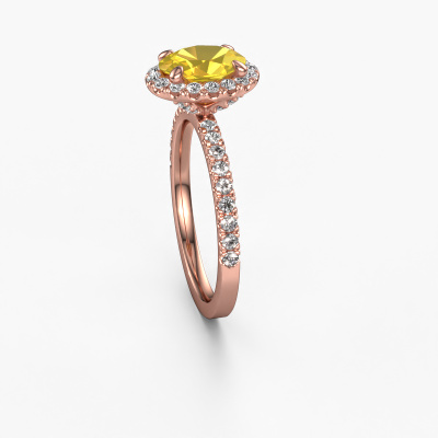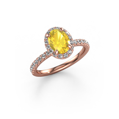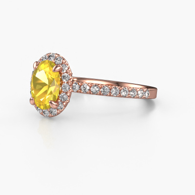 The ring shown above is called the Miranda ovl. We call this type of ring a halo ring because it has one centre gemstone and a band that is also pave set with gemstones. The 14 Carat rose gold engagement ring is set with a oval 8x6 mm yellow sapphire centre stone and the band is pave set with lab-grown diamonds. What makes this exclusive rose gold halo ring special are the smaller sized stones embracing the centre stone. This gorgeous engagement ring is called a halo ring because the smaller gemstones give the centre stone a halo of surrounding light. In order for the smaller stones to enhance the centre stone, they have to be placed so there is no interference of light. And that's when our expert goldsmiths come in. Each individual stone is carefully set in the ring by hand. During manufacturing, light fall is constantly monitored to make sure the special halo is still visible. In the end you get a unique engagement ring, with a yellow sapphire of your choosing at its centre. You can imagine the effect of a ring of such significance when you give it to her on her special day to shine. By using a combination of the latest modern techniques, combined with ancient crafting, we can make all our engagement rings in our own studio. Each jewel is made to order. This is advantageous because we can offer you a price you won't find anywhere else.Our designers and goldsmiths work together each day, creating new jewels. Perhaps you have found a nice exclusive engagement ring somewhere, which can be used to customize your unique ring. Please feel free to contact us. We will make you an offer, based on a fair price/ quality ratio, which will amaze you.To make it easier for you, we offer a 30 day return policy. Check our terms and conditions.