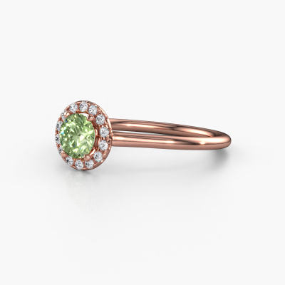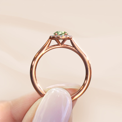 The ring shown above is called the Seline rnd 1. We call this type of ring a halo ring because it has one centre gemstone and a band that is also pave set with gemstones. The 14 Carat rose gold engagement ring is set with a round 5 mm green lab grown diamond centre stone and the band is pave set with diamonds. What makes this classic rose gold halo ring special are the smaller sized stones embracing the centre stone. This gorgeous engagement ring is called a halo ring because the smaller gemstones give the centre stone a halo of surrounding light. In order for the smaller stones to enhance the centre stone, they have to be placed so there is no interference of light. And that's when our expert goldsmiths come in. Each individual stone is carefully set in the ring by hand. During manufacturing, light fall is constantly monitored to make sure the special halo is still visible. In the end you get a unique engagement ring, with a green lab grown diamond of your choosing at its centre. You can imagine the effect of a ring of such significance when you give it to her on her special day to shine. By using our modern techniques, we can design and customize the finest quality jewels with the utmost care for you. Our engagement rings are always priced 30 percent lower than other jewellers. We make engagement rings to order so we don't have to maintain a large stock. If you have a certain budget, we are more than happy to advice you accordingly.Different styles of new rings are made daily by our team. Perhaps you have found a halo engagement ring somewhere. One you would like to give to your loved one. Please feel free to share your thoughts and design with our jewel designers. We would love to turn your design into a classic engagement ring. You can follow the development of your ring design because we use very detailed 3D drawings. On top of that, you can order a dummy of the design. A dummy is a plastic ring, which can be shaped according your ring design. You can try it on and check if the engagement ring is up to standard. We will gladly send you a non-binding offer, based on a fair price/ quality ratio. The offer will baffle you, considering the quality of the ring and gemstones.To make it easier for you, we offer a 30 day return policy. Check our terms and conditions.