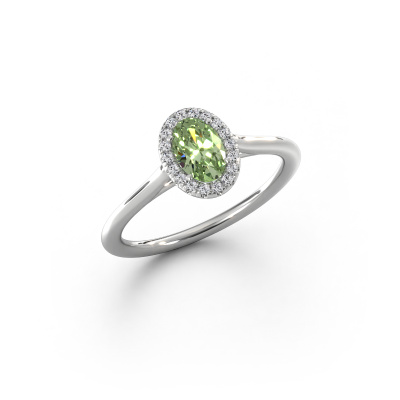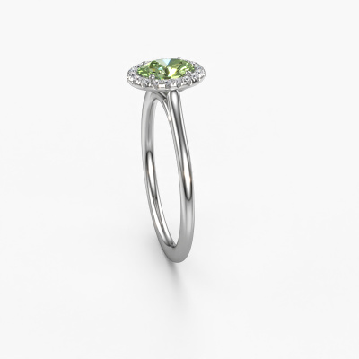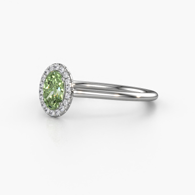 The ring shown above is called the Seline ovl 1. We call this type of ring a halo ring because it has one centre gemstone and a band that is also pave set with gemstones. The 14 Carat white gold engagement ring is set with a oval 6x4 mm green lab grown diamond centre stone and the band is pave set with diamonds. What makes this classic white gold halo ring special are the smaller sized stones embracing the centre stone. This gorgeous engagement ring is called a halo ring because the smaller gemstones give the centre stone a halo of surrounding light. In order for the smaller stones to enhance the centre stone, they have to be placed so there is no interference of light. And that's when our expert goldsmiths come in. Each individual stone is carefully set in the ring by hand. During manufacturing, light fall is constantly monitored to make sure the special halo is still visible. In the end you get a unique engagement ring, with a green lab grown diamond of your choosing at its centre. You can imagine the effect of a ring of such significance when you give it to her on her special day to shine. Are you on a budget? Please feel free to contact us, so we can go discuss your options. We offer our engagement rings at guaranteed best price, because we make them to order. You won't find such a price anywhere else!Our team adds new designs to our online collection daily. Our designers and goldsmiths work together in creating the best design. We strive to offer a diverse collection of jewels. Perhaps you have a specific jewel design in mind. One you came across somewhere. Please contact us for a free consultation. We will make you an offer, based on a fair price/ quality ratio, that will baffle you.To make it easier for you, we offer a 30 day return policy. Check our terms and conditions.