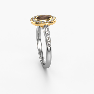 The ring shown above is called the Noud 2 OVL. We call this type of ring a halo ring because it has one centre gemstone and a band that is also pave set with gemstones. The 14 Carat white gold engagement ring is set with a oval 6x4 mm smokey quartz centre stone and the band is pave set with lab-grown diamonds. What makes this exclusive white gold halo ring special are the smaller sized stones embracing the centre stone. This gorgeous engagement ring is called a halo ring because the smaller gemstones give the centre stone a halo of surrounding light. In order for the smaller stones to enhance the centre stone, they have to be placed so there is no interference of light. And that's when our expert goldsmiths come in. Each individual stone is carefully set in the ring by hand. During manufacturing, light fall is constantly monitored to make sure the special halo is still visible. In the end you get a unique engagement ring, with a smokey quartz of your choosing at its centre. You can imagine the effect of a ring of such significance when you give it to her on her special day to shine. By using our modern techniques, we can design and customize the finest quality jewels with the utmost care for you. Our engagement rings are always priced 30 percent lower than other jewellers. We make engagement rings to order so we don't have to maintain a large stock. If you have a certain budget, we are more than happy to advice you accordingly.Have you found a specific engagement ring somewhere which you would like to give to your loved one? Please feel free to express your wishes to our jewel designers because we would be honoured to turn your design into a exclusive engagement ring. You can follow the development of your ring design because we use 3D drawings. This gives you a realistic preview of how your design will look. You can also preorder a dummy. A dummy is a plastic ring, which can be shaped according your ring design. You can try it on and check if its width and size are suitable for you. We will gladly send you a non-binding offer, based on a fair price/ quality ratio. It will amaze you, considering the quality of the ring and gemstones.To make it easier for you, we offer a 30 day return policy. Check our terms and conditions.