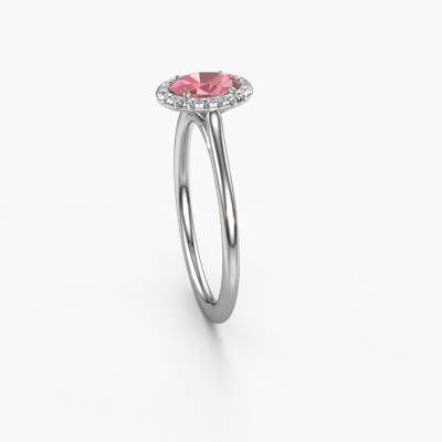 The ring shown above is called the Seline ovl 1. We call this type of ring a halo ring because it has one centre gemstone and a band that is also pave set with gemstones. The 14 Carat white gold engagement ring is set with a oval 6x4 mm tourmaline pink centre stone and the band is pave set with diamonds. What makes this classic white gold halo ring special are the smaller sized stones embracing the centre stone. This gorgeous engagement ring is called a halo ring because the smaller gemstones give the centre stone a halo of surrounding light. In order for the smaller stones to enhance the centre stone, they have to be placed so there is no interference of light. And that's when our expert goldsmiths come in. Each individual stone is carefully set in the ring by hand. During manufacturing, light fall is constantly monitored to make sure the special halo is still visible. In the end you get a unique engagement ring, with a tourmaline pink of your choosing at its centre. You can imagine the effect of a ring of such significance when you give it to her on her special day to shine. Are you on a budget? Please feel free to contact us, so we can go discuss your options. We offer our engagement rings at guaranteed best price, because we make them to order. You won't find such a price anywhere else!Our team adds new designs to our online collection daily. Our designers and goldsmiths work together in creating the best design. We strive to offer a diverse collection of jewels. Perhaps you have a specific jewel design in mind. One you came across somewhere. Please contact us for a free consultation. We will make you an offer, based on a fair price/ quality ratio, that will baffle you.To make it easier for you, we offer a 30 day return policy. Check our terms and conditions.