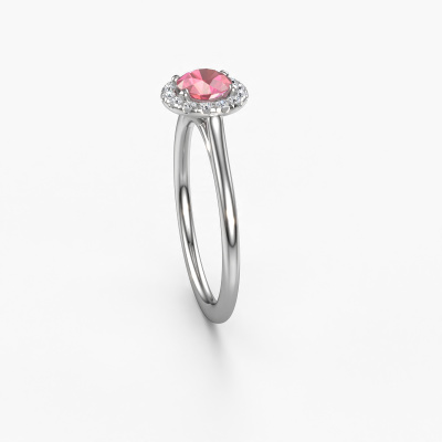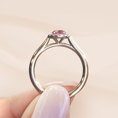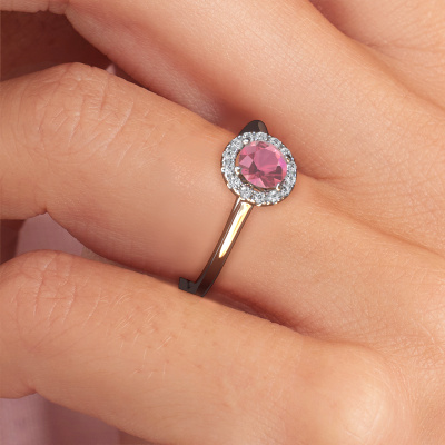 The ring shown above is called the Seline rnd 1. We call this type of ring a halo ring because it has one centre gemstone and a band that is also pave set with gemstones. The 14 Carat white gold engagement ring is set with a round 5 mm tourmaline pink centre stone and the band is pave set with diamonds. What makes this classic white gold halo ring special are the smaller sized stones embracing the centre stone. This gorgeous engagement ring is called a halo ring because the smaller gemstones give the centre stone a halo of surrounding light. In order for the smaller stones to enhance the centre stone, they have to be placed so there is no interference of light. And that's when our expert goldsmiths come in. Each individual stone is carefully set in the ring by hand. During manufacturing, light fall is constantly monitored to make sure the special halo is still visible. In the end you get a unique engagement ring, with a tourmaline pink of your choosing at its centre. You can imagine the effect of a ring of such significance when you give it to her on her special day to shine. By using our modern techniques, we can design and customize the finest quality jewels with the utmost care for you. Our engagement rings are always priced 30 percent lower than other jewellers. We make engagement rings to order so we don't have to maintain a large stock. If you have a certain budget, we are more than happy to advice you accordingly.Different styles of new rings are made daily by our team. Perhaps you have found a halo engagement ring somewhere. One you would like to give to your loved one. Please feel free to share your thoughts and design with our jewel designers. We would love to turn your design into a classic engagement ring. You can follow the development of your ring design because we use very detailed 3D drawings. On top of that, you can order a dummy of the design. A dummy is a plastic ring, which can be shaped according your ring design. You can try it on and check if the engagement ring is up to standard. We will gladly send you a non-binding offer, based on a fair price/ quality ratio. The offer will baffle you, considering the quality of the ring and gemstones.To make it easier for you, we offer a 30 day return policy. Check our terms and conditions.