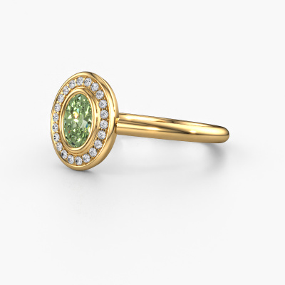 The ring shown above is called the Noud 1 OVL. We call this type of ring a halo ring because it has one centre gemstone and a band that is also pave set with gemstones. The 14 Carat gold engagement ring is set with a oval 6x4 mm green lab grown diamond centre stone and the band is pave set with lab-grown diamonds. What makes this classic gold halo ring special are the smaller sized stones embracing the centre stone. This gorgeous engagement ring is called a halo ring because the smaller gemstones give the centre stone a halo of surrounding light. In order for the smaller stones to enhance the centre stone, they have to be placed so there is no interference of light. And that's when our expert goldsmiths come in. Each individual stone is carefully set in the ring by hand. During manufacturing, light fall is constantly monitored to make sure the special halo is still visible. In the end you get a unique engagement ring, with a green lab grown diamond of your choosing at its centre. You can imagine the effect of a ring of such significance when you give it to her on her special day to shine. By using a combination of the latest modern techniques, combined with ancient crafting, we can make all our engagement rings in our own studio. Each jewel is made to order. This is advantageous because we can offer you a price you won't find anywhere else.Our team adds new designs to our online collection daily. Our designers and goldsmiths work together in creating the best design. We strive to offer a diverse collection of jewels. Perhaps you have a specific jewel design in mind. One you came across somewhere. Please contact us for a free consultation. We will make you an offer, based on a fair price/ quality ratio, that will baffle you.To make it easier for you, we offer a 30 day return policy. Check our terms and conditions.