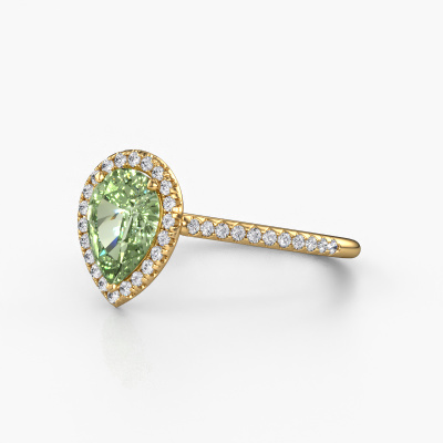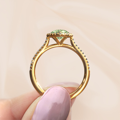The ring shown above is called the Seline per 2. We call this type of ring a halo ring because it has one centre gemstone and a band that is also pave set with gemstones. The 14 Carat gold engagement ring is set with a pear 8x6 mm green lab grown diamond centre stone and the band is pave set with diamonds. What makes this classic gold halo ring special are the smaller sized stones embracing the centre stone. This gorgeous engagement ring is called a halo ring because the smaller gemstones give the centre stone a halo of surrounding light. In order for the smaller stones to enhance the centre stone, they have to be placed so there is no interference of light. And that's when our expert goldsmiths come in. Each individual stone is carefully set in the ring by hand. During manufacturing, light fall is constantly monitored to make sure the special halo is still visible. In the end you get a unique engagement ring, with a green lab grown diamond of your choosing at its centre. You can imagine the effect of a ring of such significance when you give it to her on her special day to shine. Because we design and deliver our own rings, we can offer you a engagement ring at a price you won't find anywhere else. A ring is made to order, which helps prevent excess supplies, so we can make you a great price offer. We understand it feels risky, buying your engagement ring online, but we will gladly assist in the designing process, taking your budget into consideration.Our designers and goldsmiths work together each day, creating new jewels. Perhaps you have found a nice classic engagement ring somewhere, which can be used to customize your unique ring. Please feel free to contact us. We will make you an offer, based on a fair price/ quality ratio, which will amaze you.To make it easier for you, we offer a 30 day return policy. Check our terms and conditions.