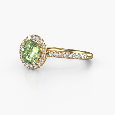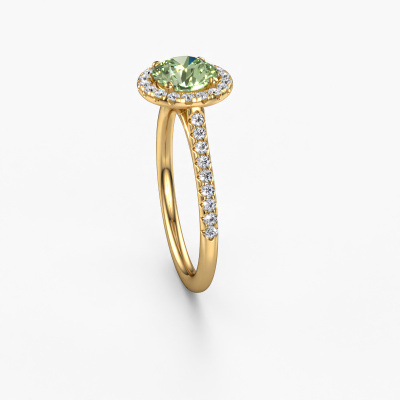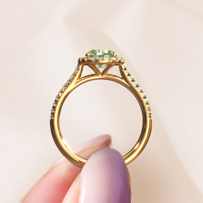 The ring shown above is called the Seline rnd 2. We call this type of ring a halo ring because it has one centre gemstone and a band that is also pave set with gemstones. The 14 Carat gold engagement ring is set with a round 6.5 mm green lab grown diamond centre stone and the band is pave set with lab-grown diamonds. What makes this exclusive gold halo ring special are the smaller sized stones embracing the centre stone. This gorgeous engagement ring is called a halo ring because the smaller gemstones give the centre stone a halo of surrounding light. In order for the smaller stones to enhance the centre stone, they have to be placed so there is no interference of light. And that's when our expert goldsmiths come in. Each individual stone is carefully set in the ring by hand. During manufacturing, light fall is constantly monitored to make sure the special halo is still visible. In the end you get a unique engagement ring, with a green lab grown diamond of your choosing at its centre. You can imagine the effect of a ring of such significance when you give it to her on her special day to shine. After receiving your order, our goldsmiths will start the creative process of making your Seline rnd 2 engagement ring. We don't keep stock. This is advantageous because these costs will not be passed on to you. Therefore, we can offer jewellery at exceptionally low prices.Our team adds new designs to our online collection daily. Our designers and goldsmiths work together in creating the best design. We strive to offer a diverse collection of jewels. Perhaps you have a specific jewel design in mind. One you came across somewhere. Please contact us for a free consultation. We will make you an offer, based on a fair price/ quality ratio, that will baffle you.To make it easier for you, we offer a 30 day return policy. Check our terms and conditions.