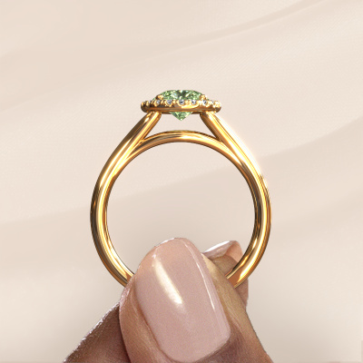 This 14 Carat gold ring is called Verla pear 1 and is set with 8x6 mm green lab grown diamond. This exclusive gold halo engagement ring is a true work of art! The ornaments are crafted with a lot of patience and great passion. In order to create this ring with great precision, this craft requires a keen eye and skilful hand. A challenge which ignites a fire in our expert goldsmith. The exquisite green lab grown diamonds are set in a special way so they stand out even more. This gives the ring an even more glamorous appearance. The graceful engagement ring is actually unique on its own because of the gemstones which we carefully select especially for this ring. On top of that you select the precious metals which will be used to create a unique ring for the most extraordinary woman in your life! This jewel is made to shine bright around your finger. Each jewel is hand made with love by our goldsmiths.By using a combination of the latest modern techniques, combined with ancient crafting, we can make all our engagement rings in our own studio. Each jewel is made to order. This is advantageous because we can offer you a price you won't find anywhere else.Have you found a specific engagement ring somewhere which you would like to give to your loved one? Please feel free to express your wishes to our jewel designers because we would be honoured to turn your design into a luxury engagement ring. You can follow the development of your ring design because we use 3D drawings. This gives you a realistic preview of how your design will look. You can also preorder a dummy. A dummy is a plastic ring, which can be shaped according your ring design. You can try it on and check if its width and size are suitable for you. We will gladly send you a non-binding offer, based on a fair price/ quality ratio. It will amaze you, considering the quality of the ring and gemstones.To make it easier for you, we offer a 30 day return policy. Check our terms and conditions.