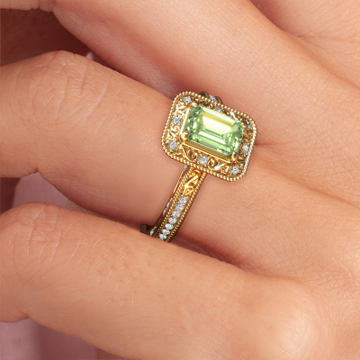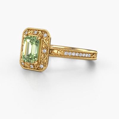 This 14 Carat gold ring is called Alice EME and is set with 7x5 mm green lab grown diamond. An extraordinary gold vintage ring. One that will surely make the love of your life shine like a diamond! That is what we hope to achieve. This vintage Engagement ring is set with exquisite green lab grown diamond. Whichever gemstone you choose from our selection, is up to you. The gemstone is selected with great care because we believe your pearl edges Engagement ring must be adorned with nothing but the most beautiful gemstone. Wouldn't you agree? Our expert goldsmith will design your ring in our own crafting studio, where the green lab grown diamond will be set with great precision. The ring will then be polished till it shines perfectly. Nothing but the best for the love of your life! This jewel is made just for you by our master goldsmiths in our own studio.By using a combination of the latest modern techniques, combined with ancient crafting, we can make all our Engagement rings in our own studio. Each jewel is made to order. This is advantageous because we can offer you a price you won't find anywhere else.Do you have a specific ring in mind? One you came across somewhere. Please feel free to tell us your wishes and we will turn your design into a unique Engagement ring. You can follow the development of your ring design because we use 3D drawings. This gives you a realistic preview of your design. We will gladly send you a non-binding offer, based on a fair price/ quality ratio. It will amaze you.To make it easier for you, we offer a 30 day return policy. Check our terms and conditions.
