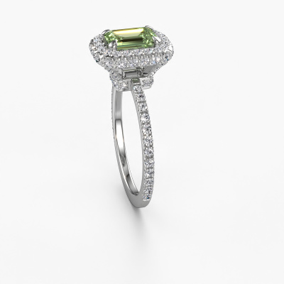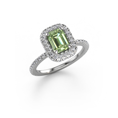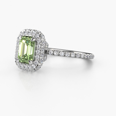 The ring shown above is called the Talitha EME. We call this type of ring a halo ring because it has one centre gemstone and a band that is also pave set with gemstones. The platinum engagement ring is set with a emerald cut 7x5 mm green lab grown diamond centre stone and the band is pave set with lab-grown diamonds. What makes this luxury platinum halo ring special are the smaller sized stones embracing the centre stone. This gorgeous engagement ring is called a halo ring because the smaller gemstones give the centre stone a halo of surrounding light. In order for the smaller stones to enhance the centre stone, they have to be placed so there is no interference of light. And that's when our expert goldsmiths come in. Each individual stone is carefully set in the ring by hand. During manufacturing, light fall is constantly monitored to make sure the special halo is still visible. In the end you get a unique engagement ring, with a green lab grown diamond of your choosing at its centre. You can imagine the effect of a ring of such significance when you give it to her on her special day to shine. By using our modern techniques, we can design and customize the finest quality jewels with the utmost care for you. Our engagement rings are always priced 30 percent lower than other jewellers. We make engagement rings to order so we don't have to maintain a large stock. If you have a certain budget, we are more than happy to advice you accordingly.Our team adds new designs to our online collection daily. Our designers and goldsmiths work together in creating the best design. We strive to offer a diverse collection of jewels. Perhaps you have a specific jewel design in mind. One you came across somewhere. Please contact us for a free consultation. We will make you an offer, based on a fair price/ quality ratio, that will baffle you.To make it easier for you, we offer a 30 day return policy. Check our terms and conditions.