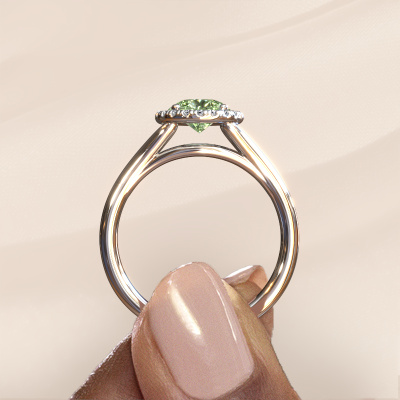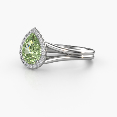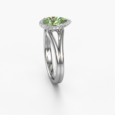 This platinum ring is called Verla pear 1 and is set with 8x6 mm green lab grown diamond. This exclusive platinum halo engagement ring is a true work of art! The ornaments are crafted with a lot of patience and great passion. In order to create this ring with great precision, this craft requires a keen eye and skilful hand. A challenge which ignites a fire in our expert goldsmith. The exquisite green lab grown diamonds are set in a special way so they stand out even more. This gives the ring an even more glamorous appearance. The graceful engagement ring is actually unique on its own because of the gemstones which we carefully select especially for this ring. On top of that you select the precious metals which will be used to create a unique ring for the most extraordinary woman in your life! This jewel is made to shine bright around your finger. Each jewel is hand made with love by our goldsmiths.By using a combination of the latest modern techniques, combined with ancient crafting, we can make all our engagement rings in our own studio. Each jewel is made to order. This is advantageous because we can offer you a price you won't find anywhere else.Have you found a specific engagement ring somewhere which you would like to give to your loved one? Please feel free to express your wishes to our jewel designers because we would be honoured to turn your design into a luxury engagement ring. You can follow the development of your ring design because we use 3D drawings. This gives you a realistic preview of how your design will look. You can also preorder a dummy. A dummy is a plastic ring, which can be shaped according your ring design. You can try it on and check if its width and size are suitable for you. We will gladly send you a non-binding offer, based on a fair price/ quality ratio. It will amaze you, considering the quality of the ring and gemstones.To make it easier for you, we offer a 30 day return policy. Check our terms and conditions.