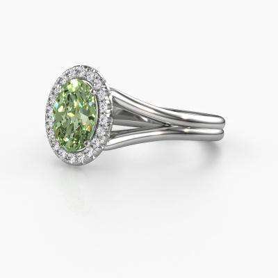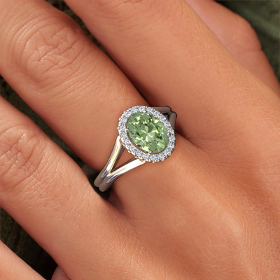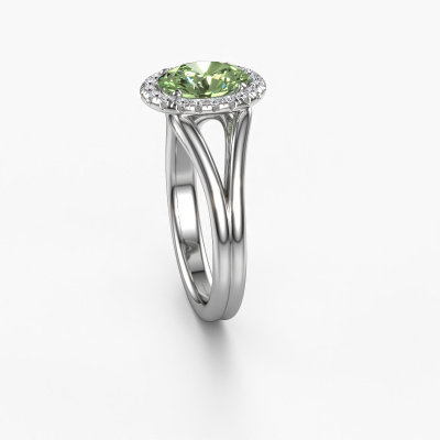 This 14 Carat white gold ring is called Verla ovl 1 and is set with 8x6 mm green lab grown diamond. This exclusive white gold halo engagement ring is a true work of art! The ornaments are crafted with a lot of patience and great passion. In order to create this ring with great precision, this craft requires a keen eye and skilful hand. A challenge which ignites a fire in our expert goldsmith. The exquisite green lab grown diamonds are set in a special way so they stand out even more. This gives the ring an even more glamorous appearance. The split band engagement ring is actually unique on its own because of the gemstones which we carefully select especially for this ring. On top of that you select the precious metals which will be used to create a unique ring for the most extraordinary woman in your life! This jewel is made to shine bright around your finger. Each jewel is hand made with love by our goldsmiths.By using a combination of the latest modern techniques, combined with ancient crafting, we can make all our engagement rings in our own studio. Each jewel is made to order. This is advantageous because we can offer you a price you won't find anywhere else.Do you have a specific ring in mind? One you came across somewhere. Please feel free to tell us your wishes and we will turn your design into a unique engagement ring. You can follow the development of your ring design because we use 3D drawings. This gives you a realistic preview of your design. We will gladly send you a non-binding offer, based on a fair price/ quality ratio. It will amaze you.To make it easier for you, we offer a 30 day return policy. Check our terms and conditions.