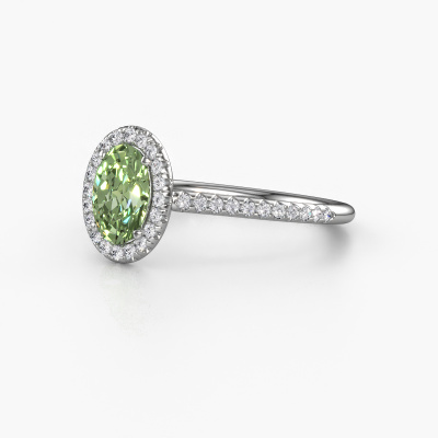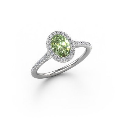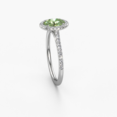 The ring shown above is called the Seline ovl 2. We call this type of ring a halo ring because it has one centre gemstone and a band that is also pave set with gemstones. The 14 Carat white gold engagement ring is set with a oval 7x5 mm green lab grown diamond centre stone and the band is pave set with diamonds. What makes this exclusive white gold halo ring special are the smaller sized stones embracing the centre stone. This gorgeous engagement ring is called a halo ring because the smaller gemstones give the centre stone a halo of surrounding light. In order for the smaller stones to enhance the centre stone, they have to be placed so there is no interference of light. And that's when our expert goldsmiths come in. Each individual stone is carefully set in the ring by hand. During manufacturing, light fall is constantly monitored to make sure the special halo is still visible. In the end you get a unique engagement ring, with a green lab grown diamond of your choosing at its centre. You can imagine the effect of a ring of such significance when you give it to her on her special day to shine. After receiving your order, our goldsmiths will start the creative process of making your Seline ovl 2 engagement ring. We don't keep stock. This is advantageous because these costs will not be passed on to you. Therefore, we can offer jewellery at exceptionally low prices.Our team adds new designs to our online collection daily. Our designers and goldsmiths work together in creating the best design. We strive to offer a diverse collection of jewels. Perhaps you have a specific jewel design in mind. One you came across somewhere. Please contact us for a free consultation. We will make you an offer, based on a fair price/ quality ratio, that will baffle you.To make it easier for you, we offer a 30 day return policy. Check our terms and conditions.