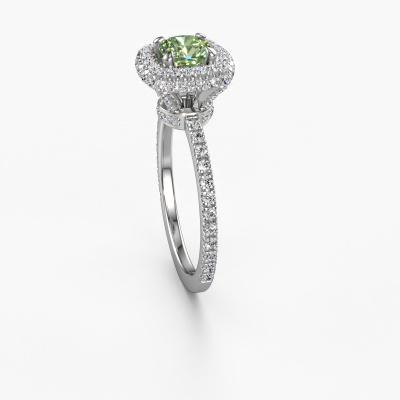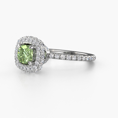 The ring shown above is called the Talitha CUS. We call this type of ring a halo ring because it has one centre gemstone and a band that is also pave set with gemstones. The 14 Carat white gold engagement ring is set with a cushion 5 mm green lab grown diamond centre stone and the band is pave set with diamonds. What makes this traditional white gold halo ring special are the smaller sized stones embracing the centre stone. This gorgeous engagement ring is called a halo ring because the smaller gemstones give the centre stone a halo of surrounding light. In order for the smaller stones to enhance the centre stone, they have to be placed so there is no interference of light. And that's when our expert goldsmiths come in. Each individual stone is carefully set in the ring by hand. During manufacturing, light fall is constantly monitored to make sure the special halo is still visible. In the end you get a unique engagement ring, with a green lab grown diamond of your choosing at its centre. You can imagine the effect of a ring of such significance when you give it to her on her special day to shine. Because we design and deliver our own rings, we can offer you a engagement ring at a price you won't find anywhere else. A ring is made to order, which helps prevent excess supplies, so we can make you a great price offer. We understand it feels risky, buying your engagement ring online, but we will gladly assist in the designing process, taking your budget into consideration.Our designers and goldsmiths work together each day, creating new jewels. Perhaps you have found a nice traditional engagement ring somewhere, which can be used to customize your unique ring. Please feel free to contact us. We will make you an offer, based on a fair price/ quality ratio, which will amaze you.To make it easier for you, we offer a 30 day return policy. Check our terms and conditions.