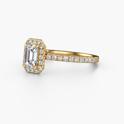 The ring shown above is called the Miranda EME. We call this type of ring a halo ring because it has one centre gemstone and a band that is also pave set with gemstones. The 14 Carat gold engagement ring is set with a emerald cut 0.70 crt lab grown diamond centre stone and the band is pave set with diamonds. What makes this classic gold halo ring special are the smaller sized stones embracing the centre stone. This gorgeous engagement ring is called a halo ring because the smaller gemstones give the centre stone a halo of surrounding light. In order for the smaller stones to enhance the centre stone, they have to be placed so there is no interference of light. And that's when our expert goldsmiths come in. Each individual stone is carefully set in the ring by hand. During manufacturing, light fall is constantly monitored to make sure the special halo is still visible. In the end you get a unique engagement ring, with a lab grown diamond of your choosing at its centre. You can imagine the effect of a ring of such significance when you give it to her on her special day to shine. By using a combination of the latest modern techniques, combined with ancient crafting, we can make all our engagement rings in our own studio. Each jewel is made to order. This is advantageous because we can offer you a price you won't find anywhere else.Our designers and goldsmiths work together each day, creating new jewels. Perhaps you have found a nice classic engagement ring somewhere, which can be used to customize your unique ring. Please feel free to contact us. We will make you an offer, based on a fair price/ quality ratio, which will amaze you.To make it easier for you, we offer a 30 day return policy. Check our terms and conditions.