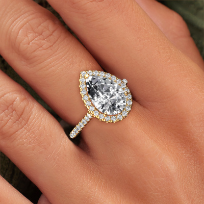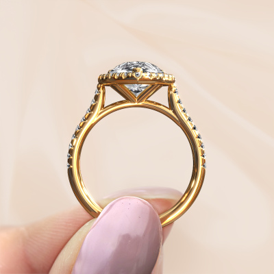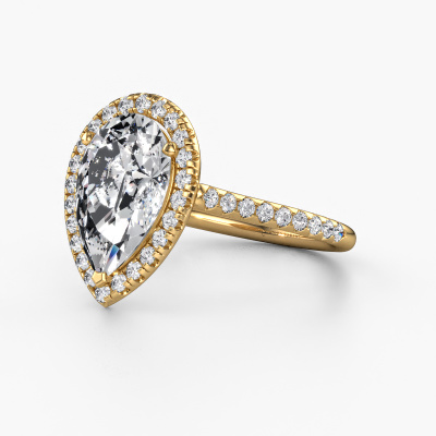 The ring shown above is called the Seline per 2. We call this type of ring a halo ring because it has one centre gemstone and a band that is also pave set with gemstones. The 14 Carat gold engagement ring is set with a pear 3.00 crt lab grown diamond centre stone and the band is pave set with diamonds. What makes this classic gold halo ring special are the smaller sized stones embracing the centre stone. This gorgeous engagement ring is called a halo ring because the smaller gemstones give the centre stone a halo of surrounding light. In order for the smaller stones to enhance the centre stone, they have to be placed so there is no interference of light. And that's when our expert goldsmiths come in. Each individual stone is carefully set in the ring by hand. During manufacturing, light fall is constantly monitored to make sure the special halo is still visible. In the end you get a unique engagement ring, with a lab grown diamond of your choosing at its centre. You can imagine the effect of a ring of such significance when you give it to her on her special day to shine. Because we design and deliver our own rings, we can offer you a engagement ring at a price you won't find anywhere else. A ring is made to order, which helps prevent excess supplies, so we can make you a great price offer. We understand it feels risky, buying your engagement ring online, but we will gladly assist in the designing process, taking your budget into consideration.Our designers and goldsmiths work together each day, creating new jewels. Perhaps you have found a nice classic engagement ring somewhere, which can be used to customize your unique ring. Please feel free to contact us. We will make you an offer, based on a fair price/ quality ratio, which will amaze you.To make it easier for you, we offer a 30 day return policy. Check our terms and conditions.