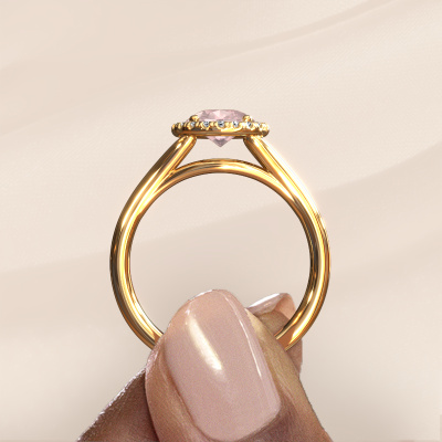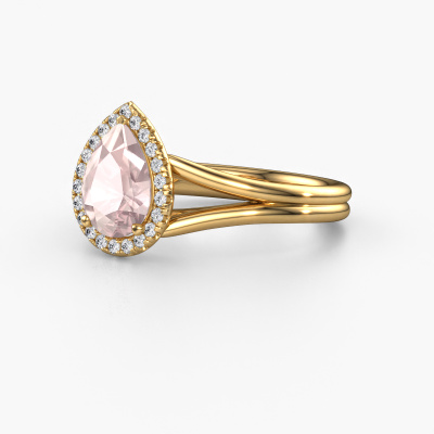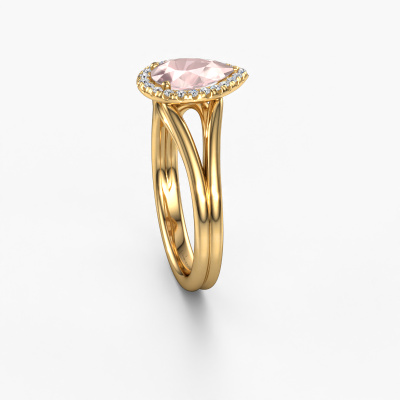 This 14 Carat gold ring is called Verla pear 1 and is set with 8x6 mm morganite champagne. This exclusive gold halo engagement ring is a true work of art! The ornaments are crafted with a lot of patience and great passion. In order to create this ring with great precision, this craft requires a keen eye and skilful hand. A challenge which ignites a fire in our expert goldsmith. The exquisite morganite champagne are set in a special way so they stand out even more. This gives the ring an even more glamorous appearance. The graceful engagement ring is actually unique on its own because of the gemstones which we carefully select especially for this ring. On top of that you select the precious metals which will be used to create a unique ring for the most extraordinary woman in your life! This jewel is made to shine bright around your finger. Each jewel is hand made with love by our goldsmiths.By using a combination of the latest modern techniques, combined with ancient crafting, we can make all our engagement rings in our own studio. Each jewel is made to order. This is advantageous because we can offer you a price you won't find anywhere else.Have you found a specific engagement ring somewhere which you would like to give to your loved one? Please feel free to express your wishes to our jewel designers because we would be honoured to turn your design into a luxury engagement ring. You can follow the development of your ring design because we use 3D drawings. This gives you a realistic preview of how your design will look. You can also preorder a dummy. A dummy is a plastic ring, which can be shaped according your ring design. You can try it on and check if its width and size are suitable for you. We will gladly send you a non-binding offer, based on a fair price/ quality ratio. It will amaze you, considering the quality of the ring and gemstones.To make it easier for you, we offer a 30 day return policy. Check our terms and conditions.