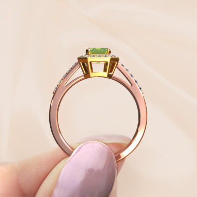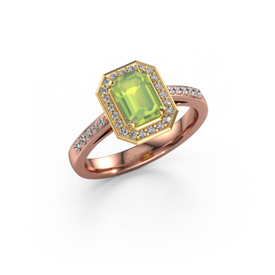 This 14 Carat rose gold ring is called Dodie 2 eme and is set with 7x5 mm peridot. This exclusive rose gold halo engagement ring is a true work of art! The ornaments are crafted with a lot of patience and great passion. In order to create this ring with great precision, this craft requires a keen eye and skilful hand. A challenge which ignites a fire in our expert goldsmith. The exquisite peridot are set in a special way so they stand out even more. This gives the ring an even more glamorous appearance. The pretty engagement ring is actually unique on its own because of the gemstones which we carefully select especially for this ring. On top of that you select the precious metals which will be used to create a unique ring for the most extraordinary woman in your life! This jewel is made just for you, with attention to detail and design.Because we design and deliver our own rings, we can offer you a engagement ring at a price you won't find anywhere else. A ring is made to order, which helps prevent excess supplies, so we can make you a great price offer. We understand it feels risky, buying your engagement ring online, but we will gladly assist in the designing process, taking your budget into consideration.Do you have a specific ring in mind? One you came across somewhere. Please feel free to tell us your wishes and we will turn your design into a unique engagement ring. You can follow the development of your ring design because we use 3D drawings. This gives you a realistic preview of your design. We will gladly send you a non-binding offer, based on a fair price/ quality ratio. It will amaze you.To make it easier for you, we offer a 30 day return policy. Check our terms and conditions.
