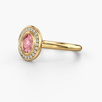 The ring shown above is called the Noud 1 OVL. We call this type of ring a halo ring because it has one centre gemstone and a band that is also pave set with gemstones. The 14 Carat gold engagement ring is set with a oval 6x4 mm pink lab grown diamond centre stone and the band is pave set with lab-grown diamonds. What makes this classic gold halo ring special are the smaller sized stones embracing the centre stone. This gorgeous engagement ring is called a halo ring because the smaller gemstones give the centre stone a halo of surrounding light. In order for the smaller stones to enhance the centre stone, they have to be placed so there is no interference of light. And that's when our expert goldsmiths come in. Each individual stone is carefully set in the ring by hand. During manufacturing, light fall is constantly monitored to make sure the special halo is still visible. In the end you get a unique engagement ring, with a pink lab grown diamond of your choosing at its centre. You can imagine the effect of a ring of such significance when you give it to her on her special day to shine. By using a combination of the latest modern techniques, combined with ancient crafting, we can make all our engagement rings in our own studio. Each jewel is made to order. This is advantageous because we can offer you a price you won't find anywhere else.Our team adds new designs to our online collection daily. Our designers and goldsmiths work together in creating the best design. We strive to offer a diverse collection of jewels. Perhaps you have a specific jewel design in mind. One you came across somewhere. Please contact us for a free consultation. We will make you an offer, based on a fair price/ quality ratio, that will baffle you.To make it easier for you, we offer a 30 day return policy. Check our terms and conditions.
