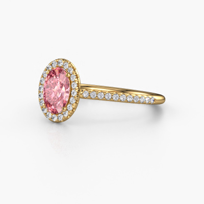 The ring shown above is called the Seline ovl 2. We call this type of ring a halo ring because it has one centre gemstone and a band that is also pave set with gemstones. The 14 Carat gold engagement ring is set with a oval 7x5 mm pink lab grown diamond centre stone and the band is pave set with diamonds. What makes this exclusive gold halo ring special are the smaller sized stones embracing the centre stone. This gorgeous engagement ring is called a halo ring because the smaller gemstones give the centre stone a halo of surrounding light. In order for the smaller stones to enhance the centre stone, they have to be placed so there is no interference of light. And that's when our expert goldsmiths come in. Each individual stone is carefully set in the ring by hand. During manufacturing, light fall is constantly monitored to make sure the special halo is still visible. In the end you get a unique engagement ring, with a pink lab grown diamond of your choosing at its centre. You can imagine the effect of a ring of such significance when you give it to her on her special day to shine. After receiving your order, our goldsmiths will start the creative process of making your Seline ovl 2 engagement ring. We don't keep stock. This is advantageous because these costs will not be passed on to you. Therefore, we can offer jewellery at exceptionally low prices.Our team adds new designs to our online collection daily. Our designers and goldsmiths work together in creating the best design. We strive to offer a diverse collection of jewels. Perhaps you have a specific jewel design in mind. One you came across somewhere. Please contact us for a free consultation. We will make you an offer, based on a fair price/ quality ratio, that will baffle you.To make it easier for you, we offer a 30 day return policy. Check our terms and conditions.